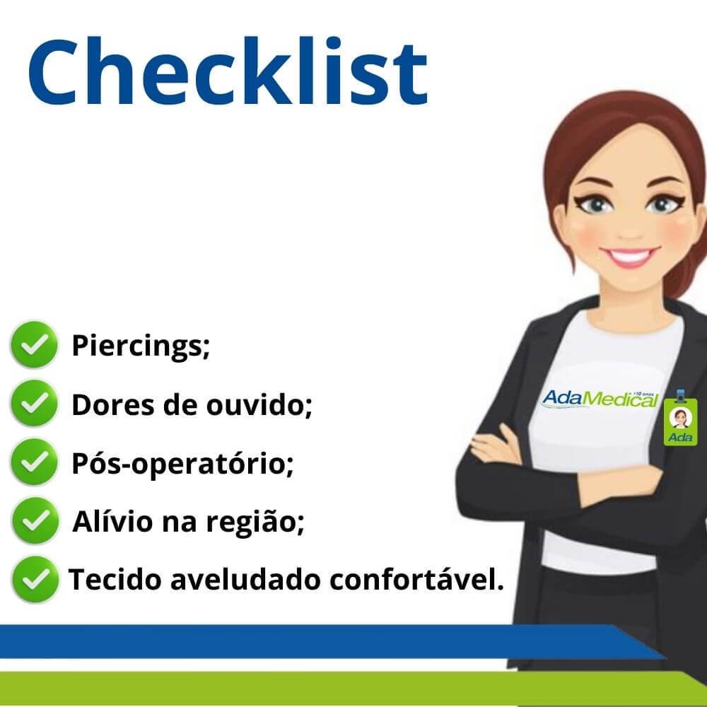 Desenvolvida com orifício central que possibilita o encaixe e proteção perfeita para orelha, além de contar com a faixa elástica que adere a cabeça impossibilitando de que a almofada se desloque, evitando atrito.