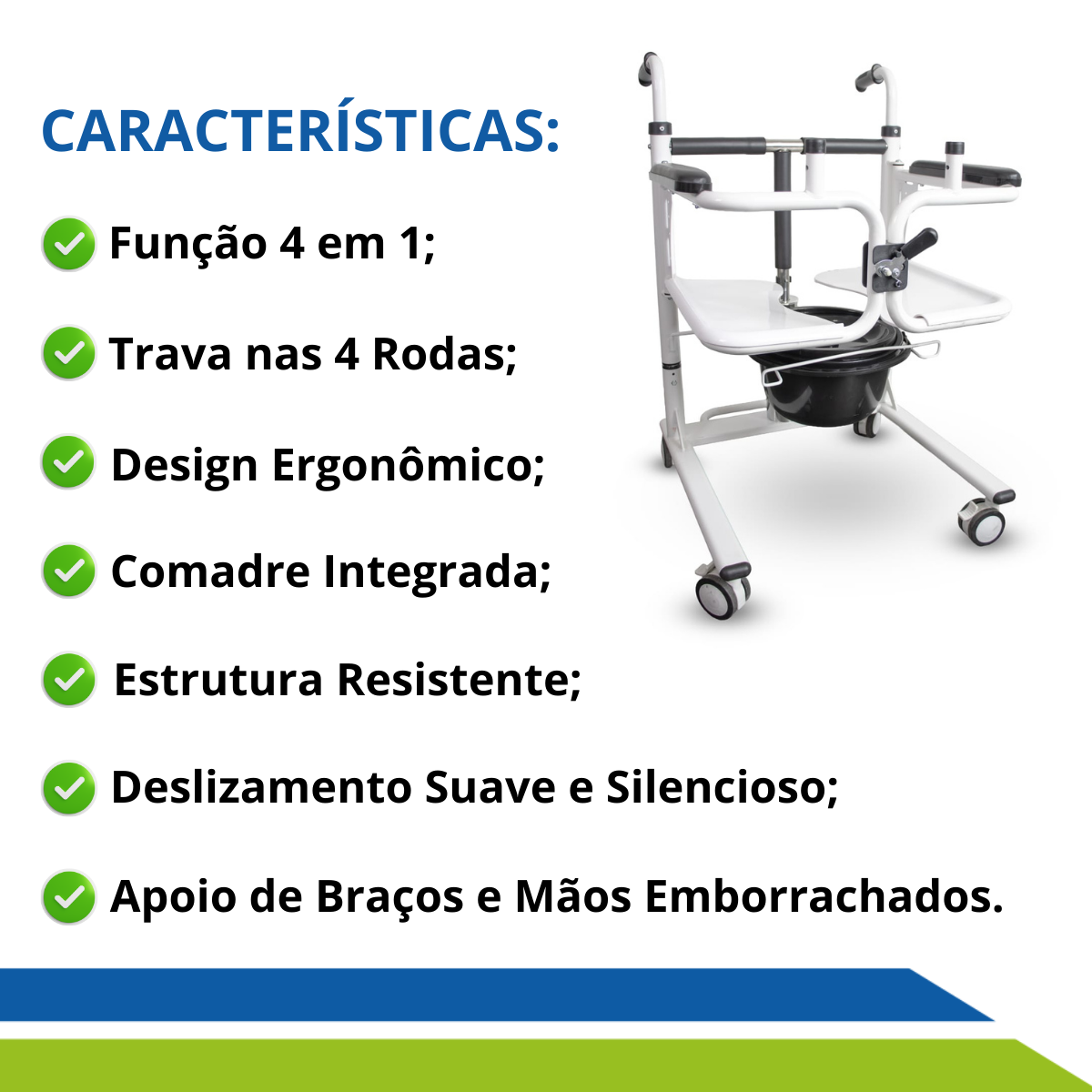 - Função 4 em 1: Cadeira de banho, Transferência, Cadeira de Rodas ( simples ) e Guincho.