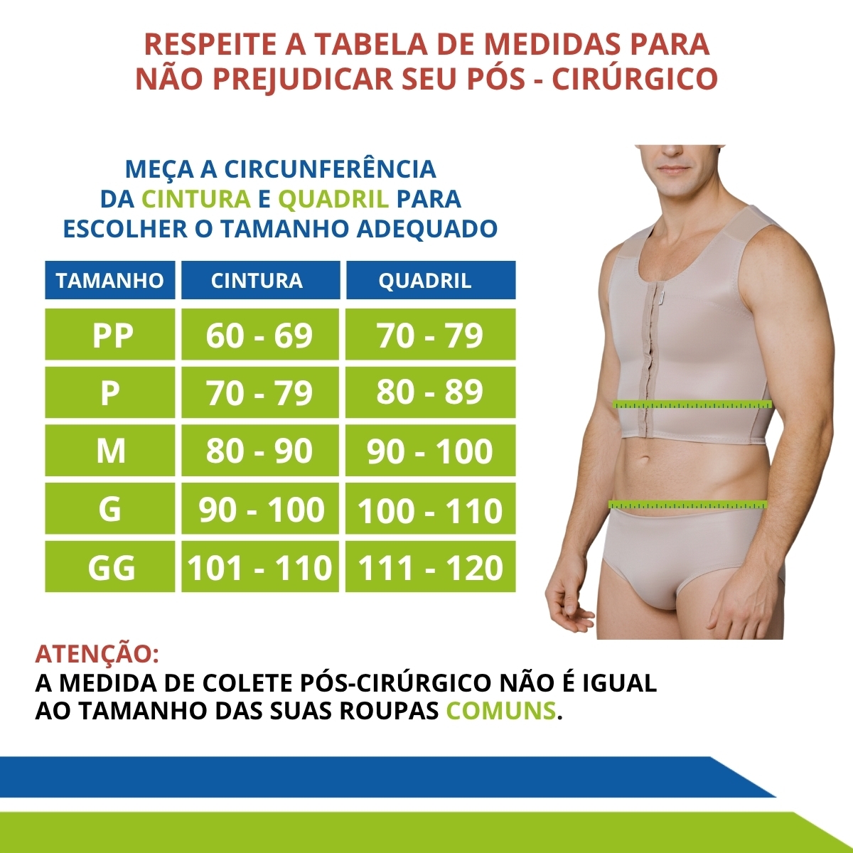 Nunca compre um colete em tamanho menor, porque ou não vai fechar ou vai ficar extremamente desconfortável podendo causar edemas e fibrose.