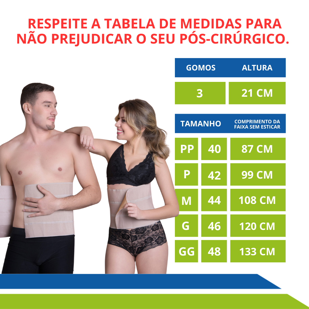 A Faixa Elástica 3 Gomos foi desenvolvida para oferecer Suporte e Compressão durante a sua recuperação Pós-Cirúrgica.