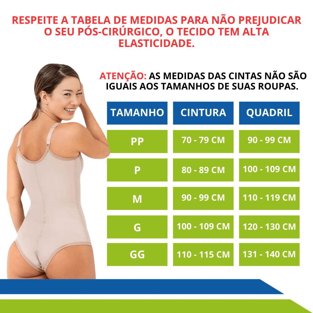 Todas as costuras das cintas são externas para não marcar o corpo nem causar desconforto durante o processo pós-cirúrgico isso porque a pele fica fragilizada e esse desconforto pode atrapalhar o resultado da cirurgia.
