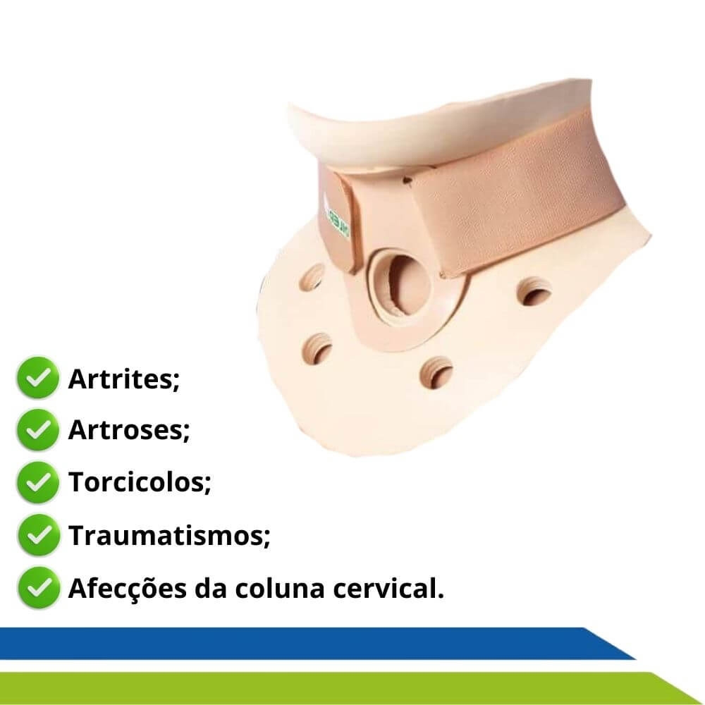 Confeccionado em espuma de polifórmio. Proporciona controle de flexão, extensão e rotação. Perfurado para melhor ventilação. Possui orifício para traqueostomia e fechamento através de fecho de contato.