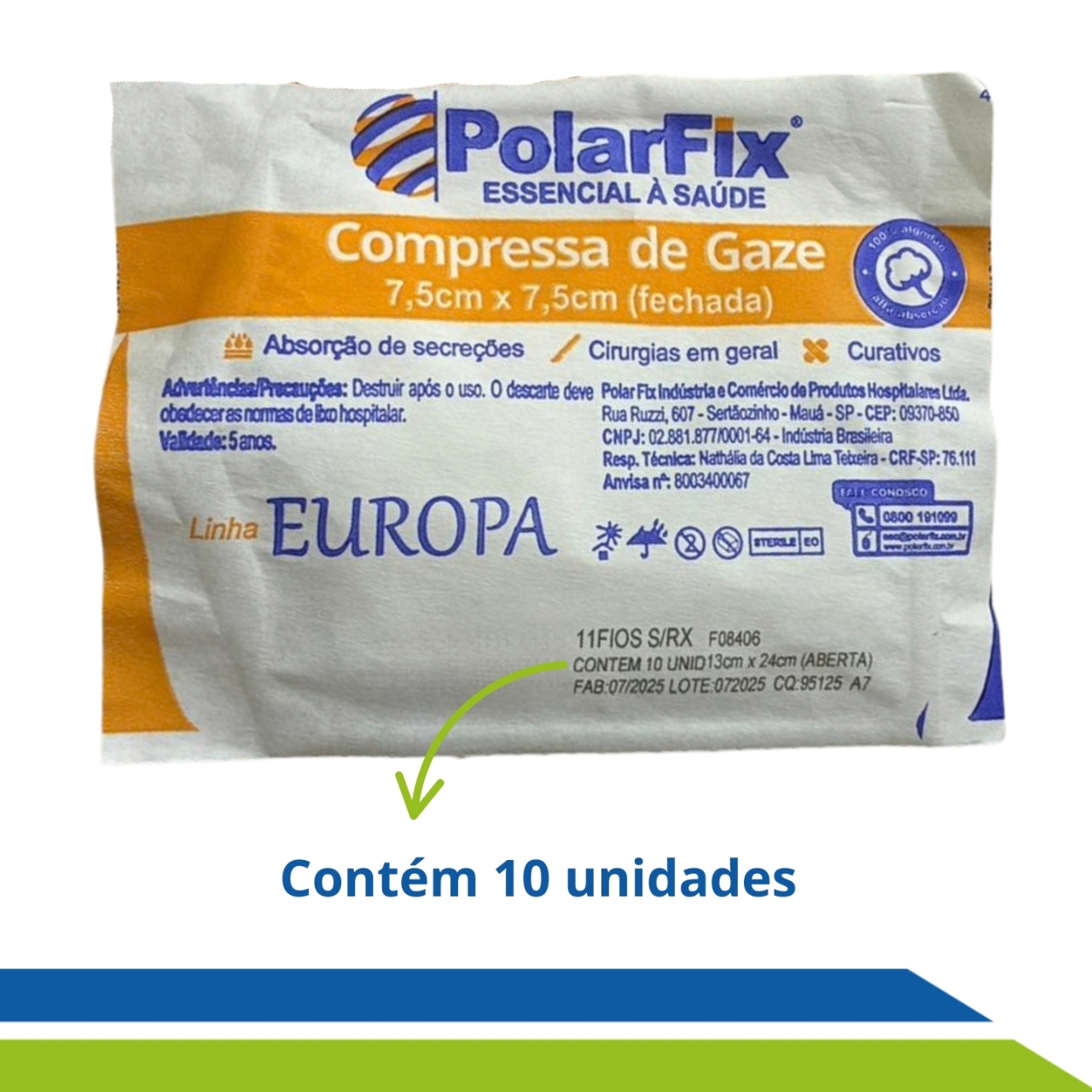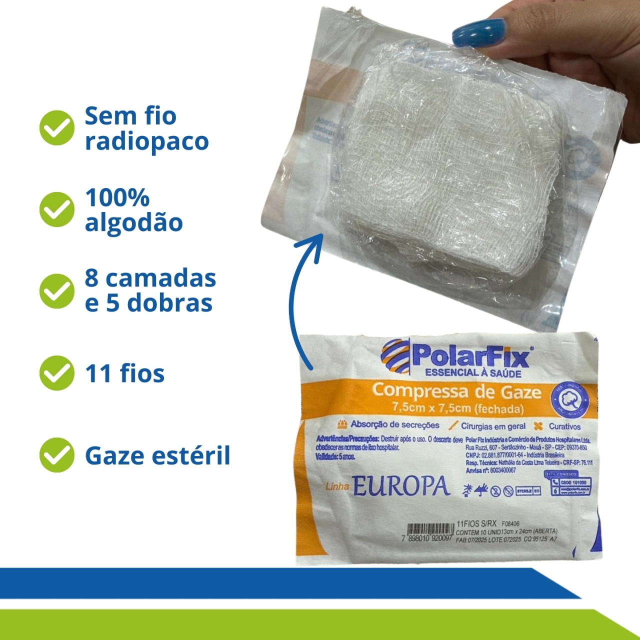 Produzida em 100% algodão, a compressa possui 8 camadas e 5 dobras, proporcionando estrutura adequada para absorção de líquidos e secreções. O produto é esterilizado e embalado individualmente, pronto para uso, garantindo maior praticidade no manuseio.