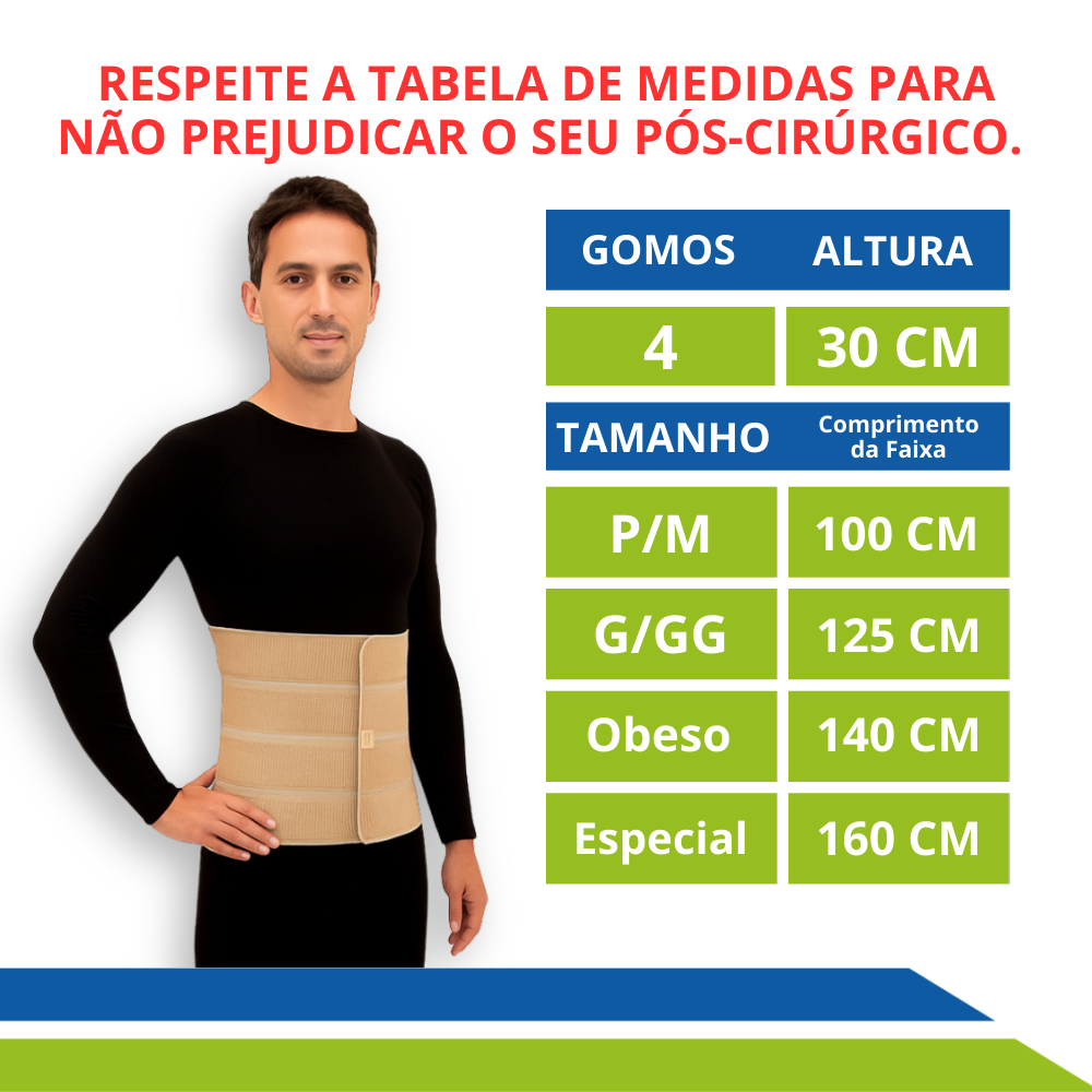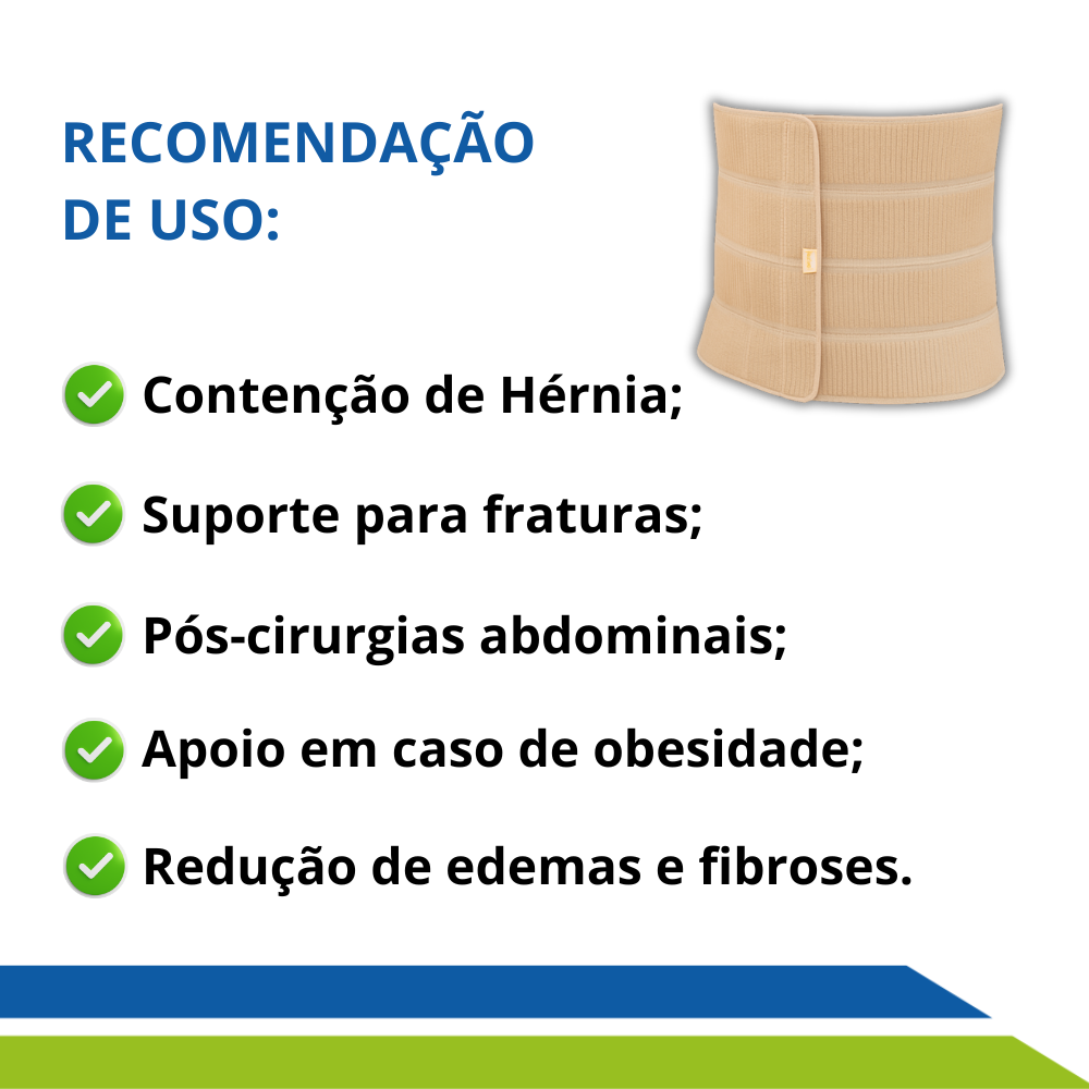 Perfeita para o período de recuperação pós-operatório, auxilia na redução do risco de edemas e fibroses, além de oferecer sustentação em casos de hérnias ou obesidade.