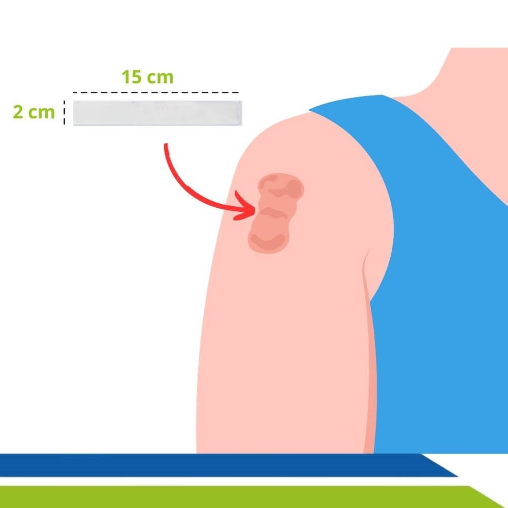 - Retirar o filme de proteção da fita de gel de silicone e aplicá-la sobre a cicatriz, com a parte adesiva da fita voltada para a pele;
