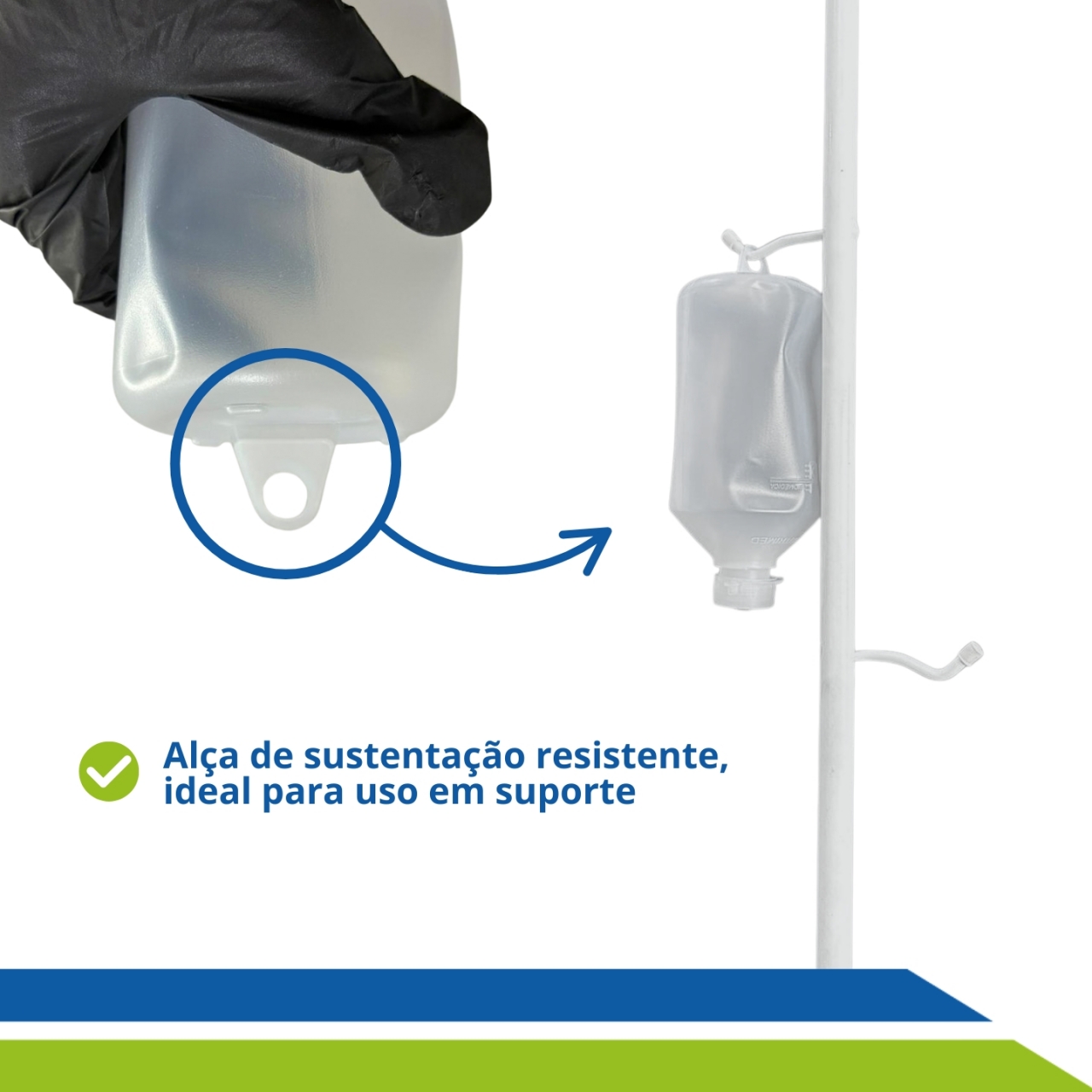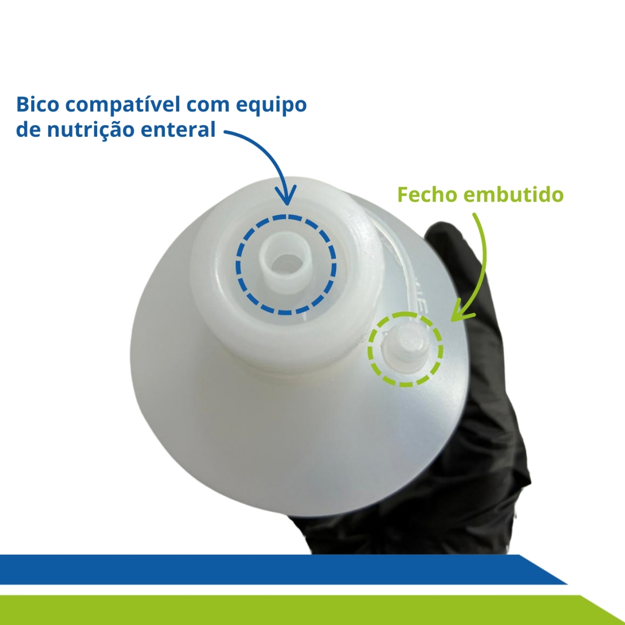 Possui graduação lateral, tampa de rosca com obturador, bico compatível com equipo e alça de sustentação resistente, permitindo que o frasco seja pendurado em suporte e utilize a força da gravidade para a administração da nutrição enteral.