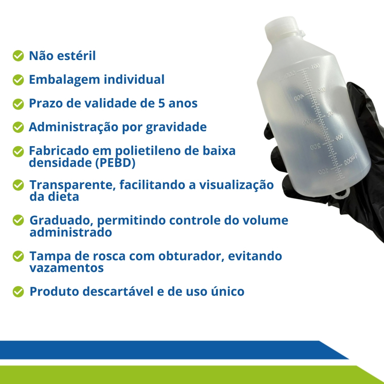 Fabricado em polietileno de baixa densidade (PEBD) de alta qualidade, o frasco é transparente, facilitando o controle visual do volume e do envase da dieta.
