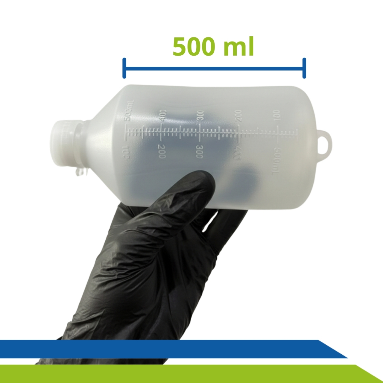 Frasco para Nutrição Enteral 500ml, transparente e graduado, com tampa de rosca, bico compatível com equipo e alça para administração segura por gravidade em ambientes hospitalares ou domiciliares.