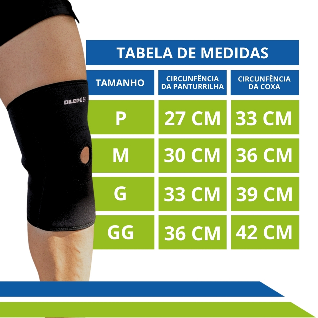 Joelheira ortopédica em neoprene Dilepé com suporte na rótula, compressão confortável e estabilidade para o joelho. Disponível nos modelos curto e longo, ideal para esportes, prevenção e recuperação de lesões.