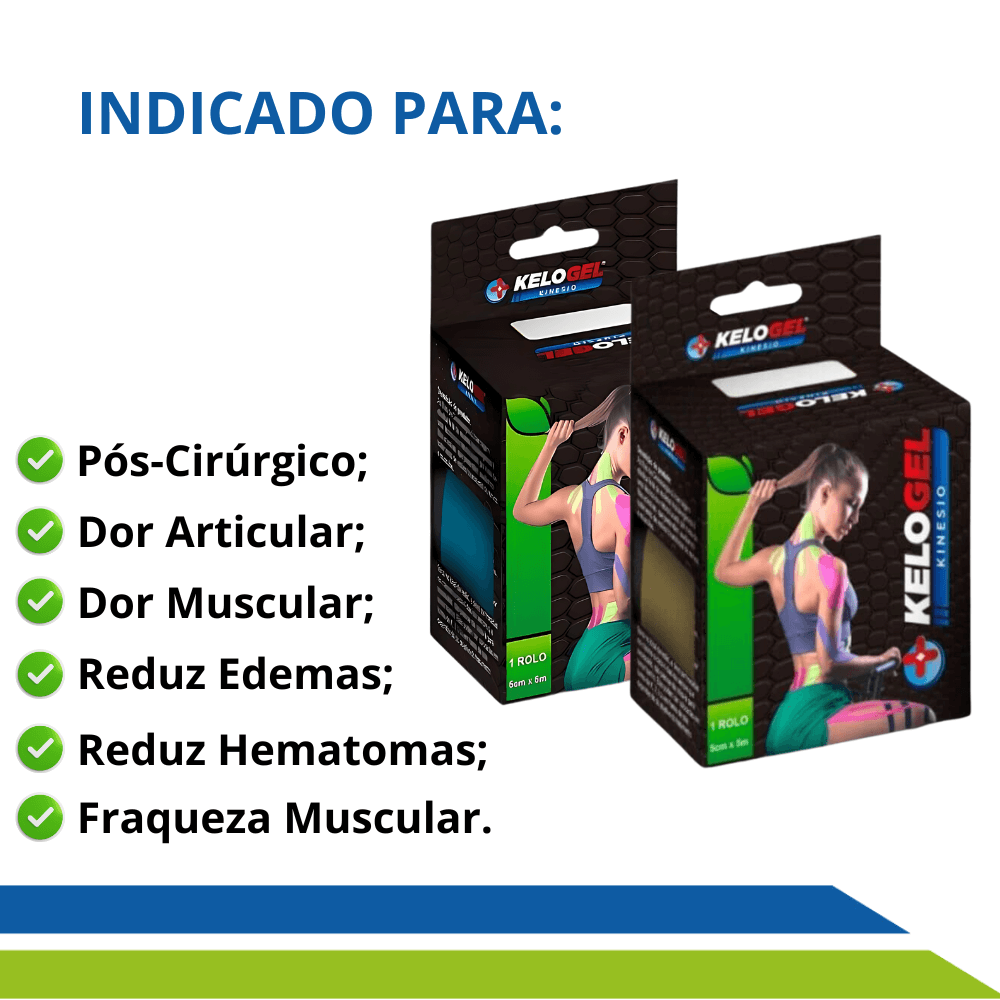 A Fita de Kinésio Kelogel foi desenvolvida para oferecer suporte, alívio e estabilidade em situações como pós-operatório, cirurgias plásticas, pós-parto, lesões e até treinos na academia. É ideal para reduzir dores musculares, acelerar a recuperação e promover melhor estabilidade articular. 💪