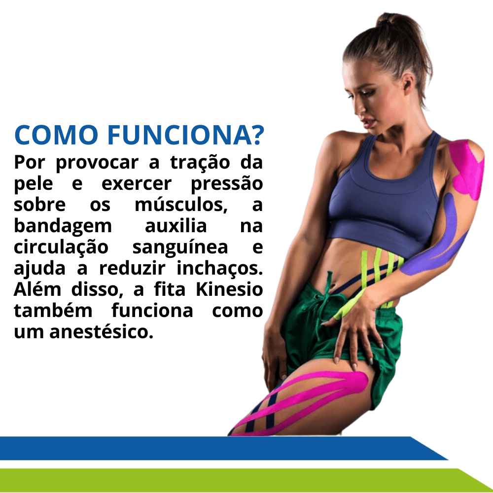 A Bandagem Elástica atua tracionando suavemente a pele, aplicando pressão controlada sobre os músculos, auxiliando a circulação sanguínea, reduzindo inchaços e proporcionando sensação de alívio imediato, semelhante a um efeito anestésico.