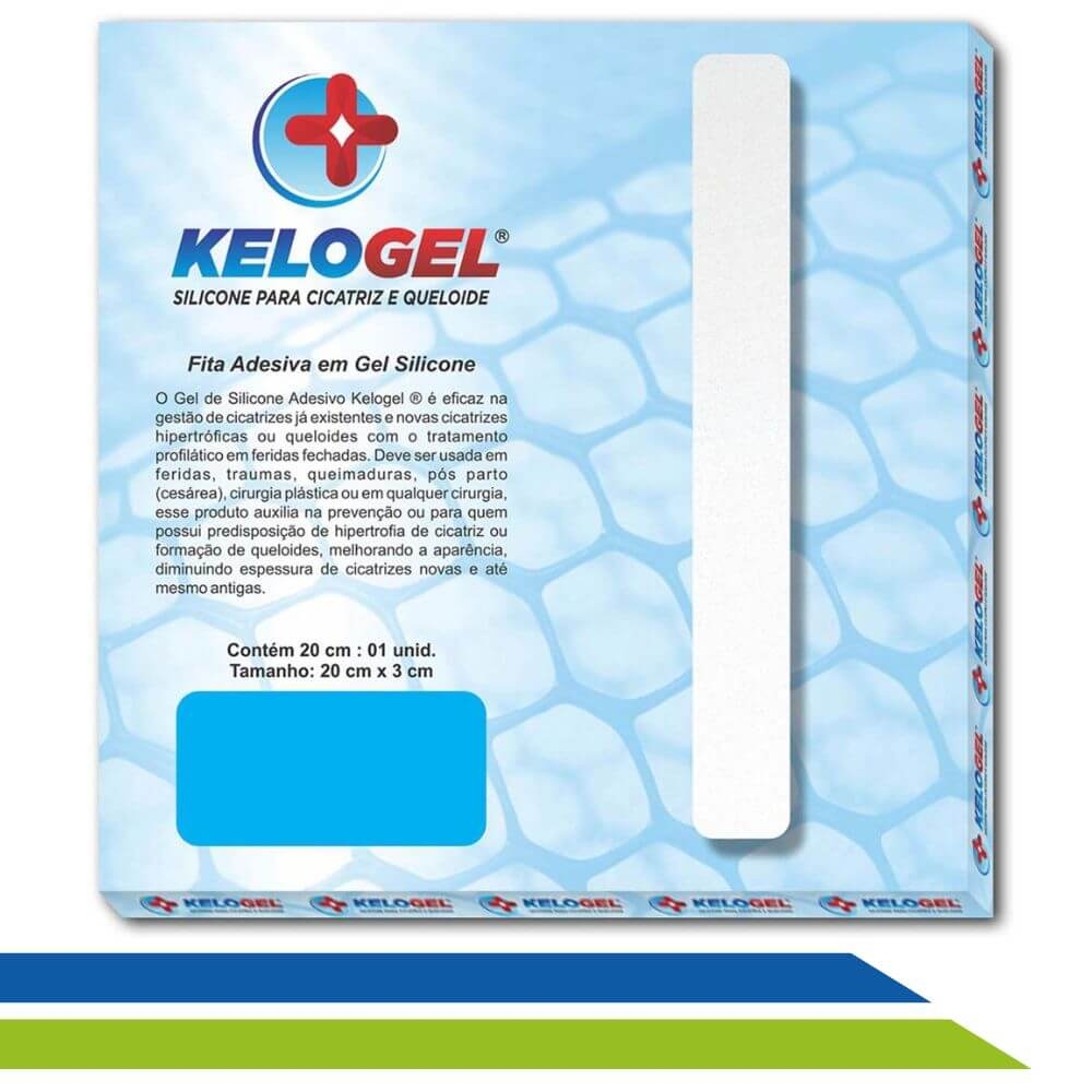 A Fita de Silicone Adesivo Kelogel é um produto suave que alinha, suaviza atenua cicatrizes vermelhas e elevadas, decorrente de cirurgias plásticas, acidentes, cortes e queimaduras, fazendo com que o local tratado produza mais líquido e hidratando a pele, diminuindo espessura de cicatrizes novas e até mesmo antigas.