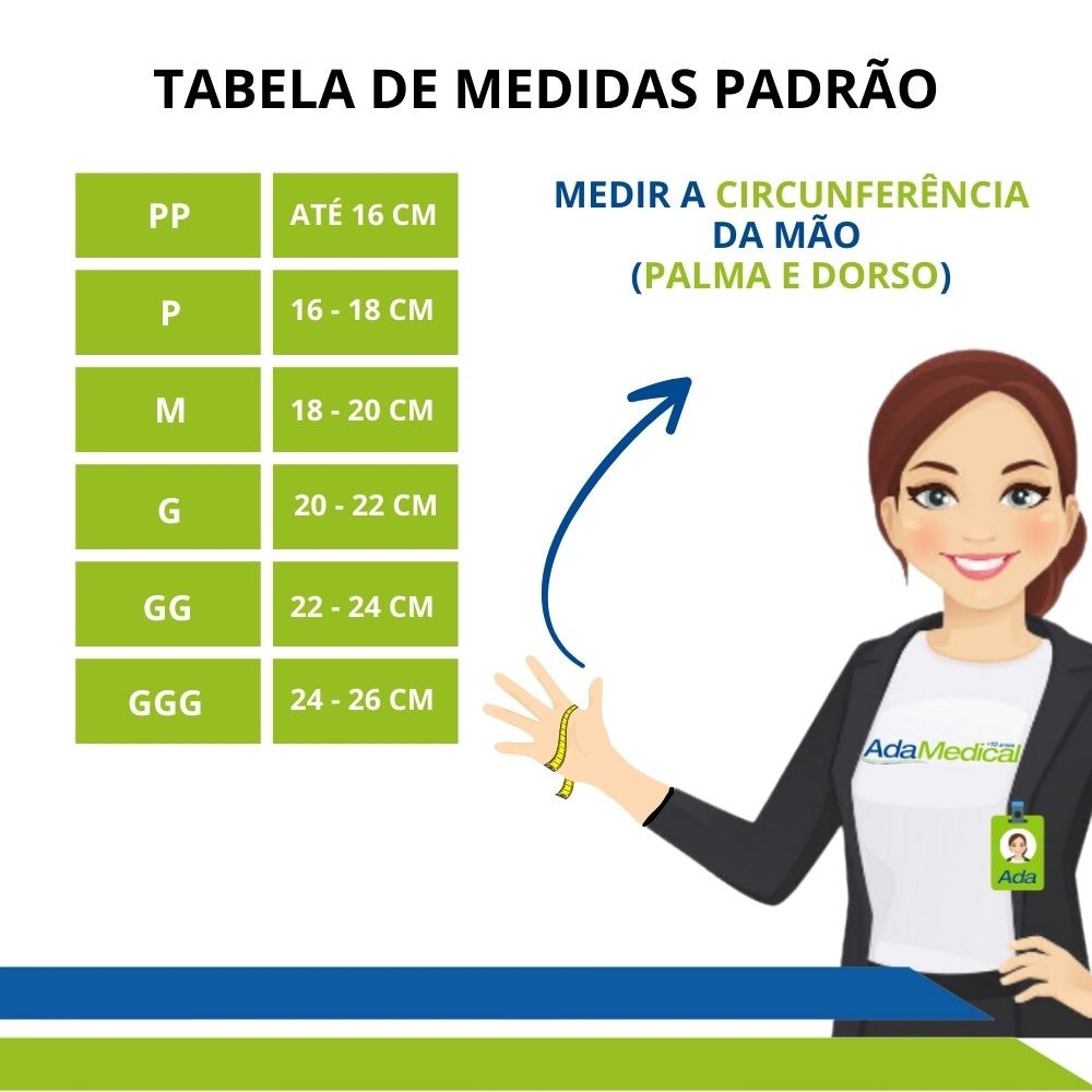 Com a ajuda de uma fita métrica, tire a medida da circunferência da palma da mão, compare a sua medida com a tabela de medidas.
