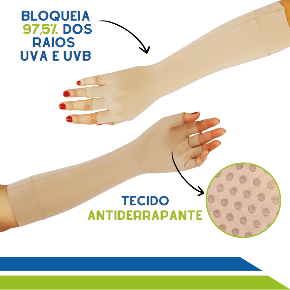 Saiba mais [+]As luvas e manguito de proteção solar da New Form bloqueiam 97,5% dos raios UVA e UVB. É recomendada para uso no dia a dia, ao exercer atividades como caminhar, pedalar, dirigir e em todos os momentos que suas mãos e/ou braços ficarem expostas ao sol por muito tempo. Também é aconselhável para tratamentos dermatológicos que exigem que a pele não seja exposta ao sol (aplicações de laser, pós peeling e queimaduras).
