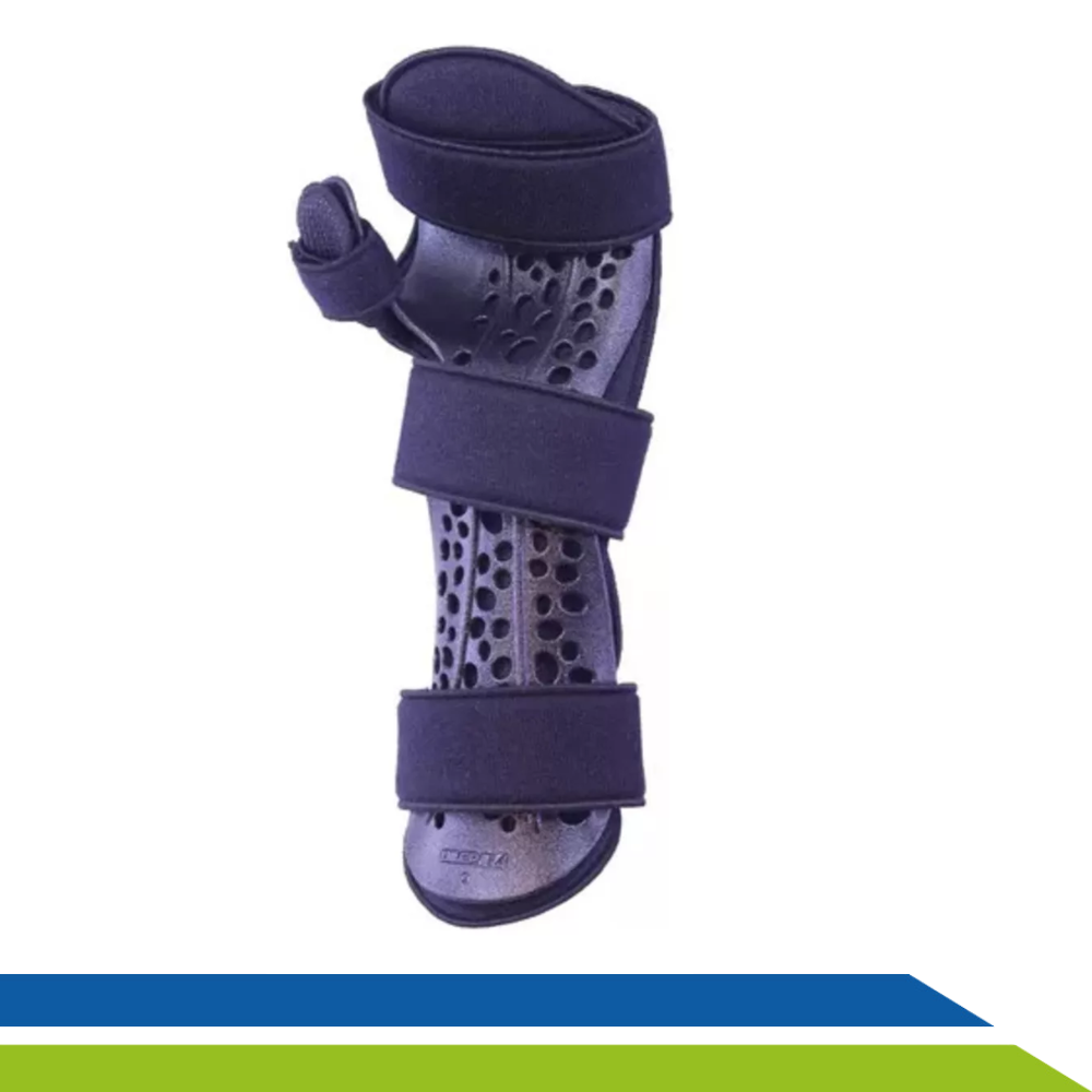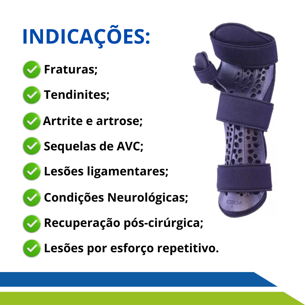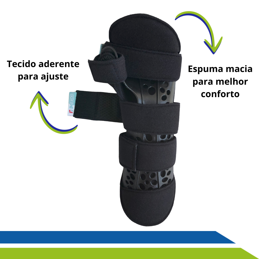 Confeccionado em copolímero, possui um formato anatômico que acomoda confortavelmente o membro, além de possuir forração interna proporcionando maciez e fixação ajustável através de fechos aderentes.