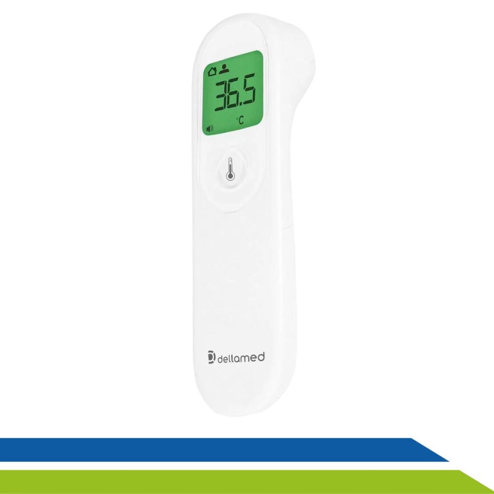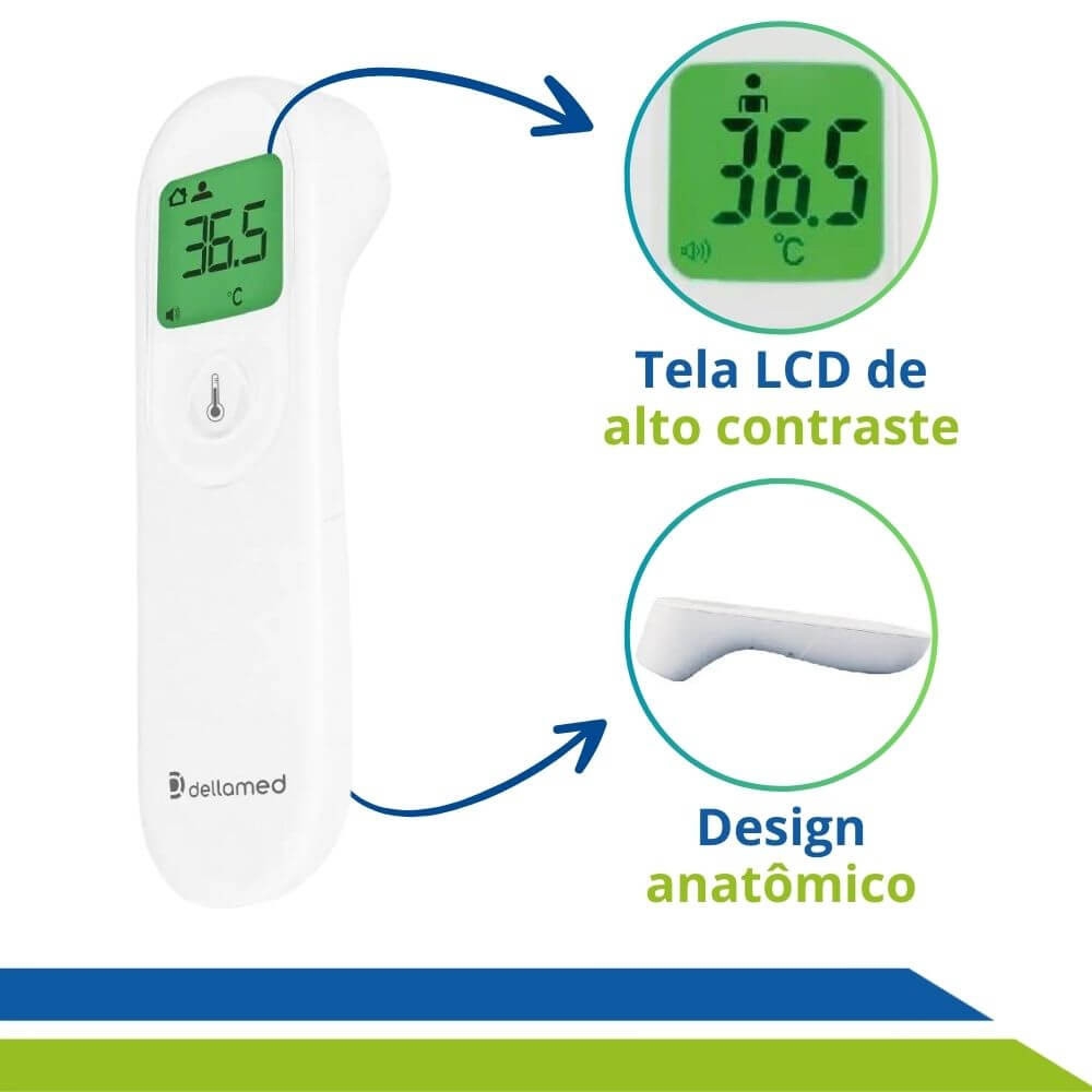 ➡️ O termômetro possui indicação por cores na tela, mostrando temperatura normal, febril e alta.