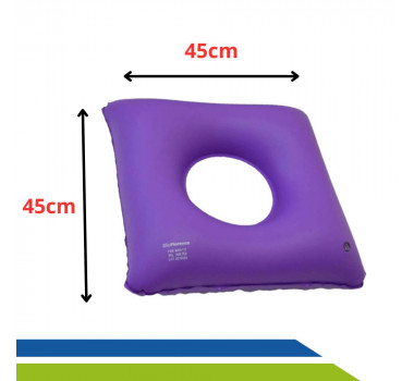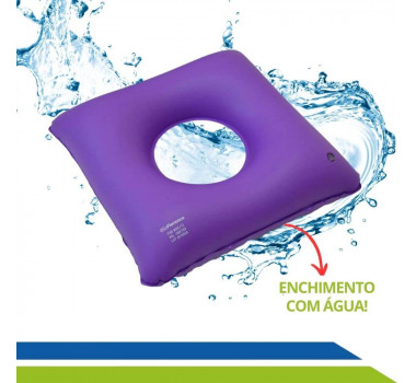 A Almofada Quadrada com Orifício Água, ajuda na prevenção e no tratamento da úlcera de pressão (escaras). Pessoas que permanecem sentadas por longos períodos e cadeirantes.