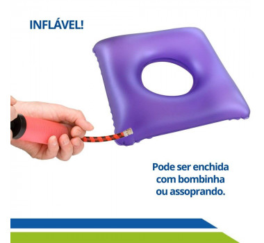 O Assento Inflável com Orifício ajuda na prevenção e no tratamento da úlcera de pressão (escaras). Utilizado por pessoas que permanecem sentadas por longos períodos e usuário de Cadeira de Rodas.