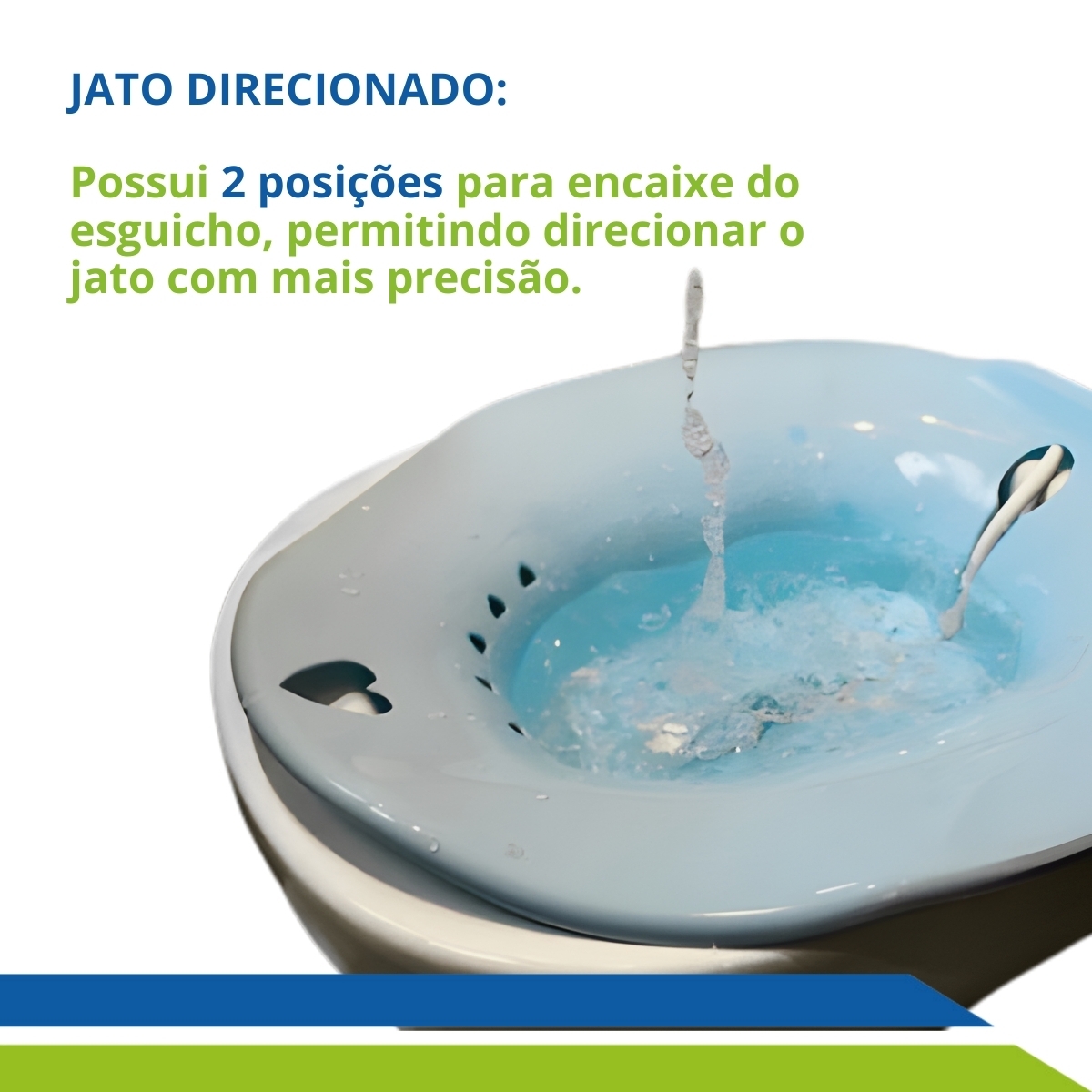 O produto conta com dois possíveis locais para posicionar o jato, tendo a possibilidade de realizar o banho desejado de forma completa e precisa, oferece também uma fácil usabilidade, uma vez que basta encaixar o jato no local desejado, derramar o líquido sobre a bacia e pressionar a bomba para que o jato seja expelido. Além disso possui diversos orifícios na parte frontal e traseira para que o líquido seja drenado de forma simples e rápida no local de sua preferência.