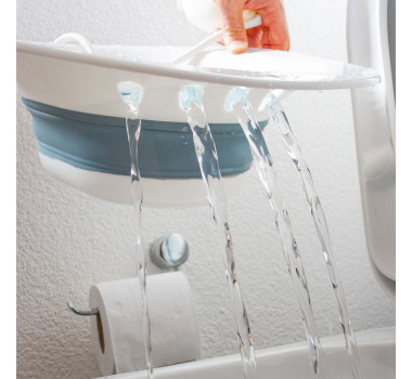 O produto conta com dois possíveis locais para posicionar o jato, tendo a possibilidade de realizar o banho desejado de forma completa e precisa, oferece também uma fácil usabilidade, uma vez que basta encaixar o jato no local desejado, derramar o líquido sobre a bacia e pressionar a bomba para que o jato seja expelido. Além disso possui diversos orifícios na parte frontal e traseira para que o líquido seja drenado de forma simples e rápida no local de sua preferência.