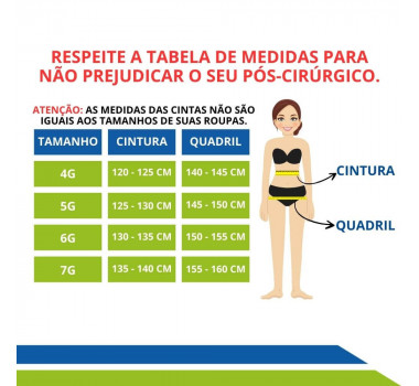 Importante comprar sua cinta seguindo as indicações da tabela de medidas, lembrando que o tamanho correto é essencial para que sua cinta não cause compressão excessiva e você consiga ter um pós cirúrgico de qualidade.