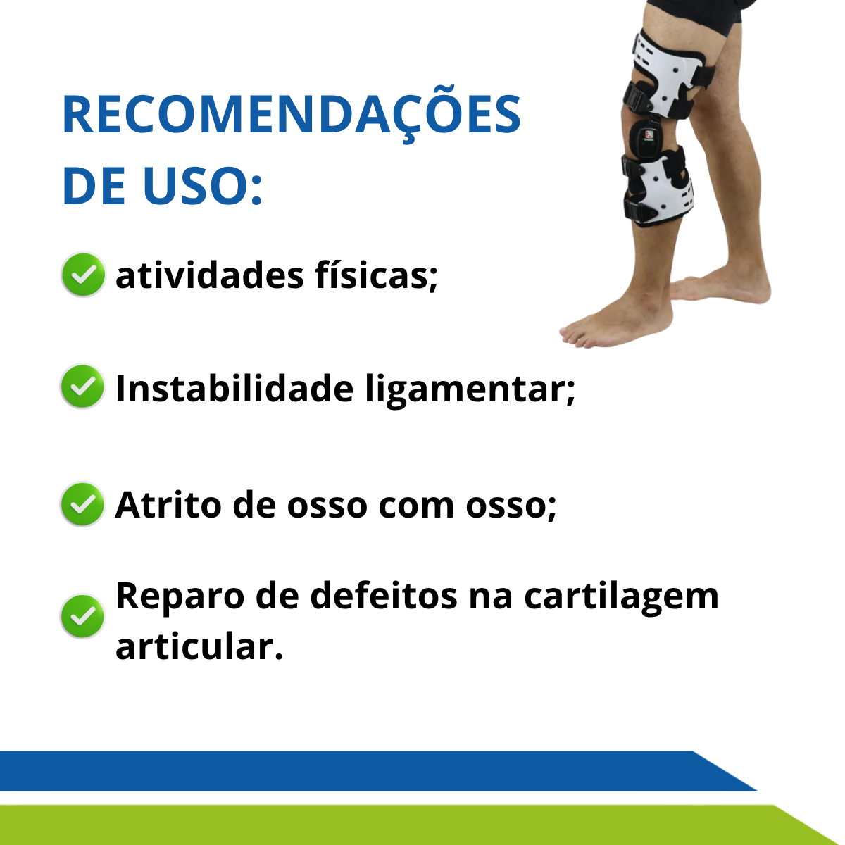 - Utilize o brace de joelho ao realizar atividades físicas de alto impacto, exercícios, caminhadas e durante a reabilitação;