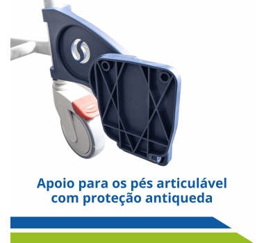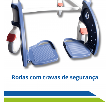 Seu assento ergonômico foi cuidadosamente projetado para se adaptar a diferentes larguras pélvicas e posturas, garantindo bem-estar mesmo durante períodos mais longos de uso. A segurança é reforçada pelo apoio para os pés articulável, que conta com proteção antiqueda, minimizando riscos e proporcionando maior tranquilidade. As quatro rodas giratórias (360°) possuem travas individuais, permitindo manobrar a cadeira com facilidade e fixá-la firmemente no local desejado.