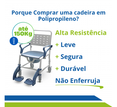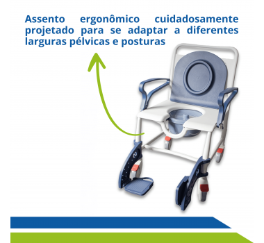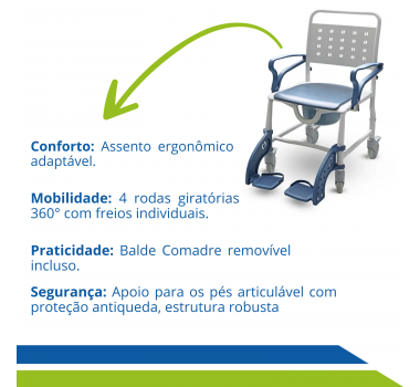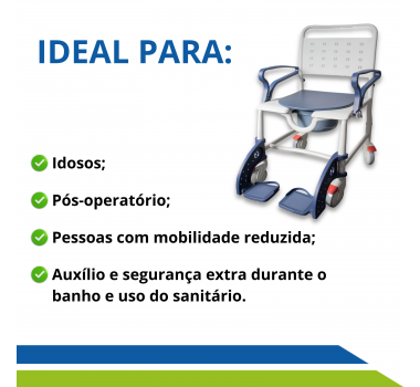 - Banho Seguro: Proporciona um assento estável e confortável durante o banho, com rodas que facilitam a movimentação e freios que garantem a imobilidade quando necessário.