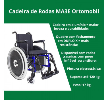 A Cadeira de Rodas Modelo MA3E, especialmente desenvolvida com os mais criteriosos padrões de qualidade para garantir qualidade, conforto e resistência com o que há de mais inovador no mercado em termos de mobilidade e melhorando a rotina e cotidiano dos usuários.