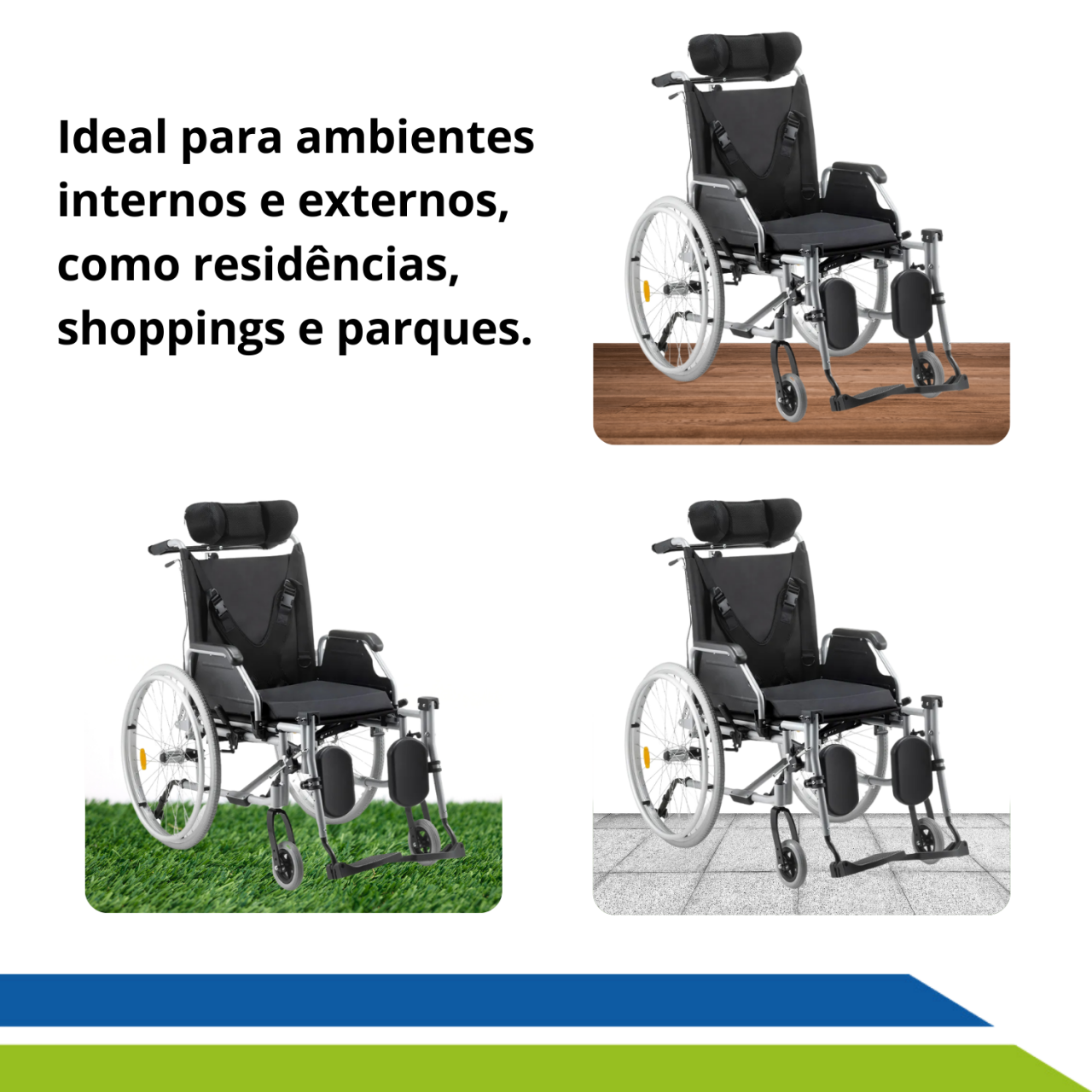 - Rodas Traseiras Grandes: Facilitam a locomoção em diferentes superfícies, com empunhadura antiderrapante para o cuidador;