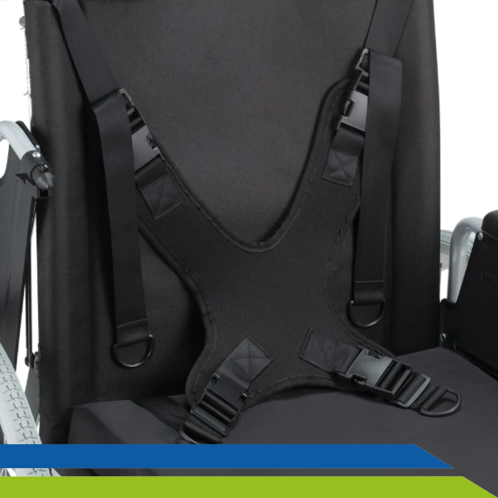 - Conta com cinto torácico, apoio de panturrilha com elevação, anti-tombo, almofada, apoio de braços e pernas escamoteáveis, e pedais com ajuste de altura;