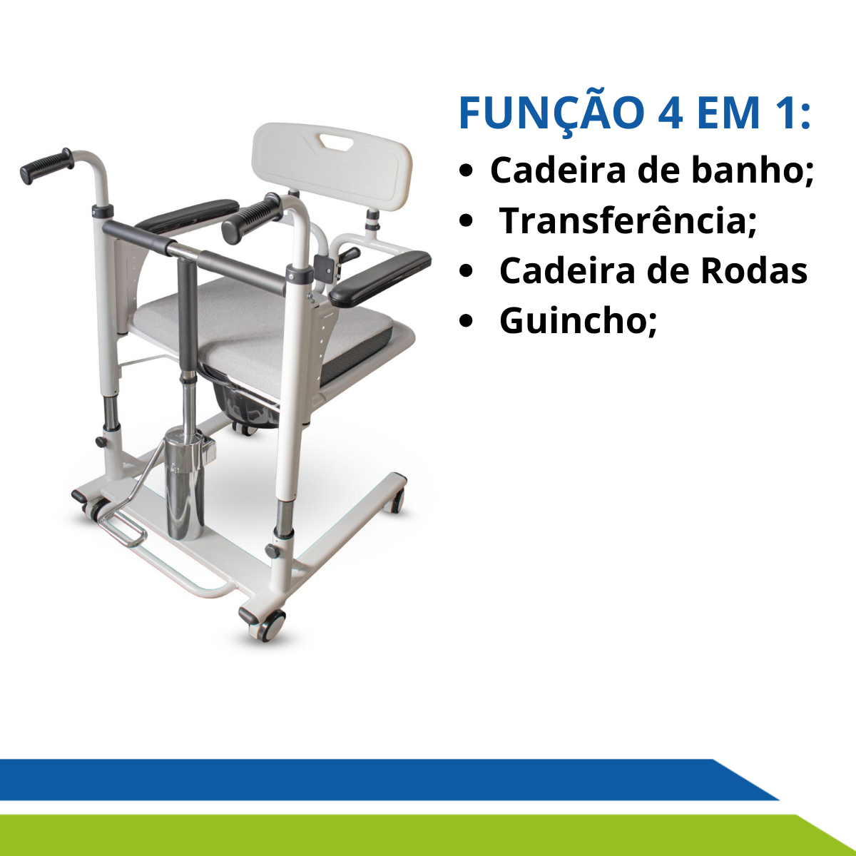 - Função 4 em 1: Cadeira de banho, Transferência, Cadeira de Rodas ( simples ) e Guincho.