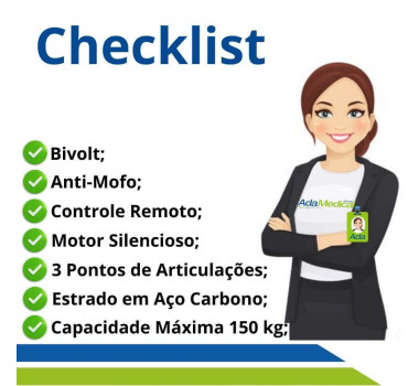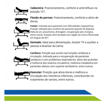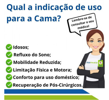 Ela possui 2 movimentos (regulagem da altura dos pés e cabeceira) promovendo melhor circulação e melhor posicionamento. Sendo 3 pontos de articulação (joelhos, coxas e lombar) permitindo ao usuário escolher a posição ideal para refeições, ler, assistir televisão ou simplesmente descansar.