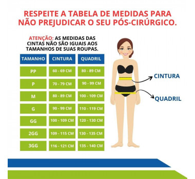 Para saber o tamanho correto da cinta você precisa medir a circunferência da cintura e do quadril, com o auxílio de uma fita métrica contorne sua cintura mais ou menos dois dedos acima da altura do umbigo, já para o quadril você deve medir logo abaixo do osso lateral mais saliente do quadril, geralmente fica cerca de 20 cm abaixo da cintura.