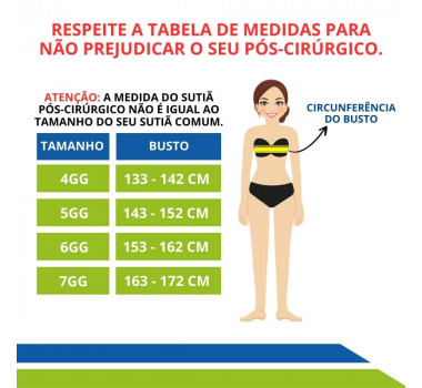 A medida a levar em consideração no momento da compra é justamente a circunferência abaixo do seio já que o sutiã tem a finalidade de dar sustentação ao seio e não deixar que as próteses se movimentem durante o processo pós-operatório.
