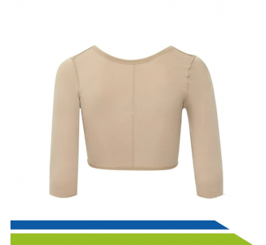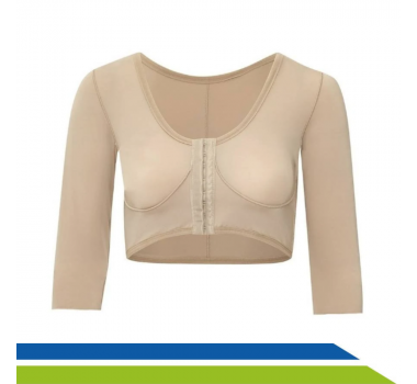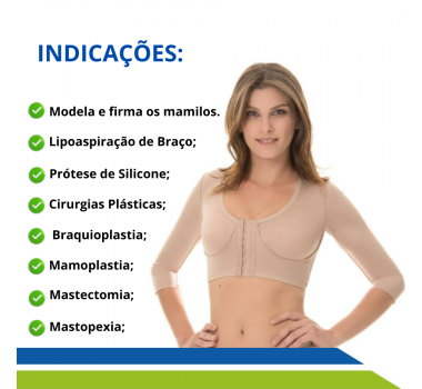 Produzida em poliamida e elastano, o sutiã como mangas 3/4 compressivas auxilia a melhora da circulação sanguínea, evitando o aumento da fibrose e do inchaço que surgem devido ao Pós-Operatório.