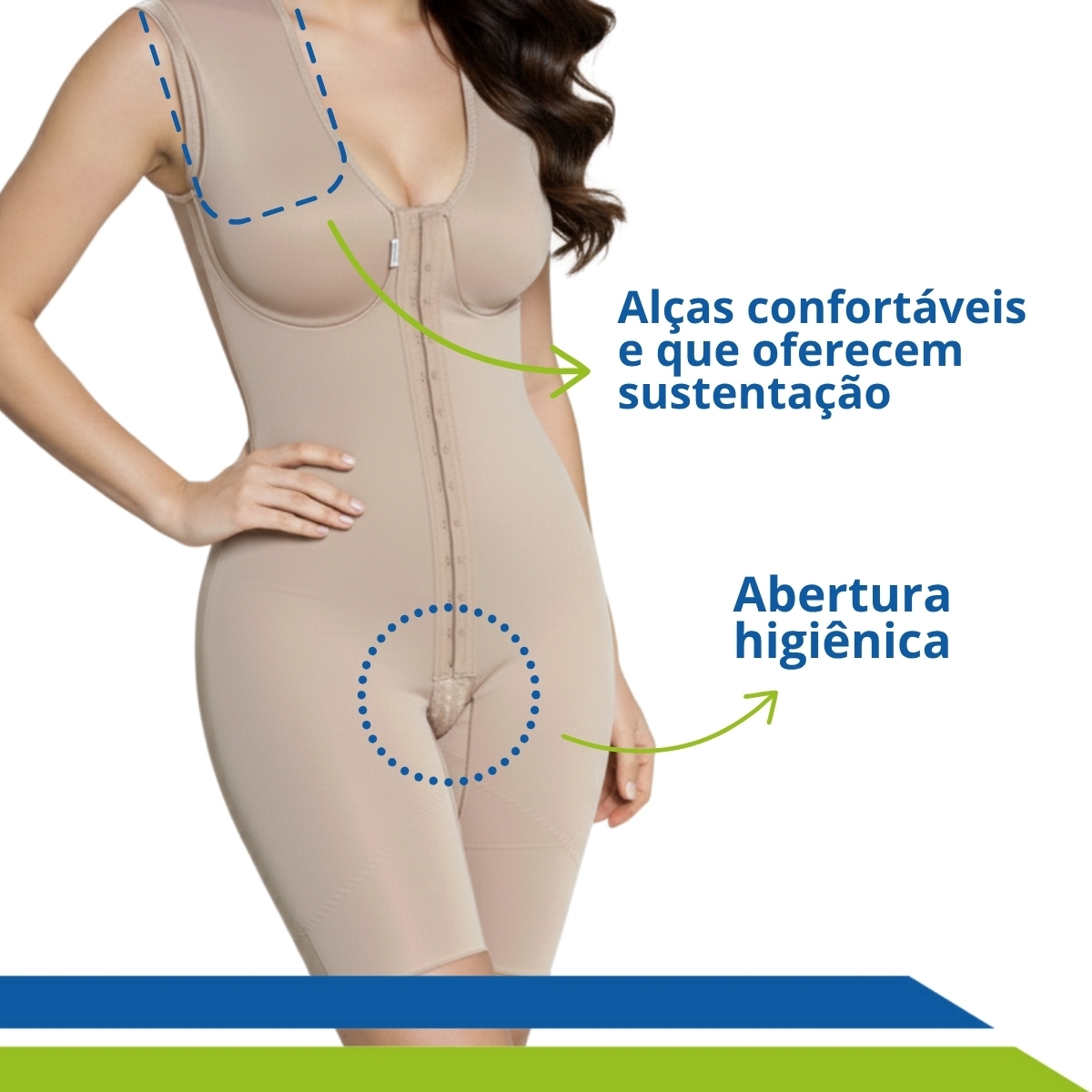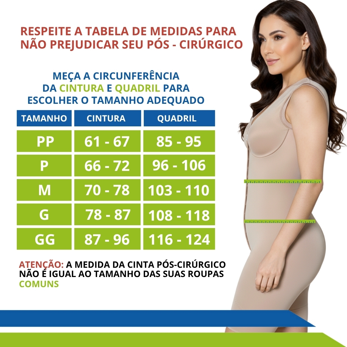 Todas as costuras das cintas são externas para não marcar o corpo nem causar desconforto durante o processo pós-cirúrgico isso porque a pele fica fragilizada e esse desconforto pode atrapalhar o resultado da cirurgia.