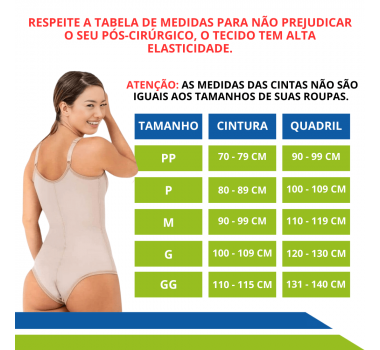 Todas as costuras das cintas são externas para não marcar o corpo nem causar desconforto durante o processo pós-cirúrgico isso porque a pele fica fragilizada e esse desconforto pode atrapalhar o resultado da cirurgia.