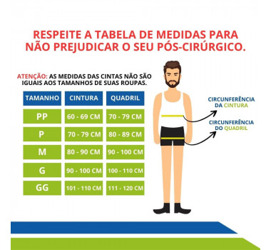 Para saber o tamanho correto da cinta você precisa medir a circunferência da cintura e do quadril, com o auxílio de uma fita métrica contorne sua cintura mais ou menos dois dedos acima da altura do umbigo, já para o quadril você deve medir logo abaixo do osso lateral mais saliente do quadril, geralmente fica cerca de 20 cm abaixo da cintura.