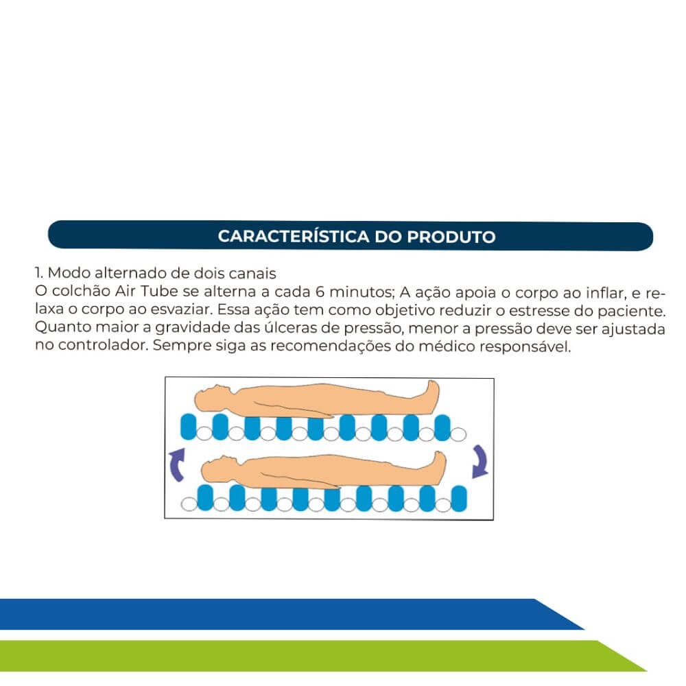 O Colchão Pneumático Air Tube trata e previne úlceras e escaras através do sistema de alívio de pressão alternada sobre as áreas do corpo. Possui um sistema de 23 tubos independentes interconectados em material ultra resistente.