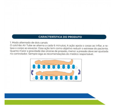 O Colchão Pneumático Air Tube trata e previne úlceras e escaras através do sistema de alívio de pressão alternada sobre as áreas do corpo. Possui um sistema de 23 tubos independentes interconectados em material ultra resistente.
