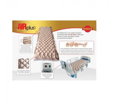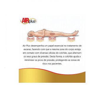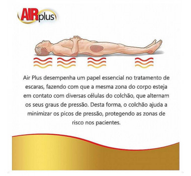 O Sistema Air Plus massageia e estimula os tecidos inativos promovendo a circulação, é simples de usar e Econômico. Suporta o corpo todo do paciente em uma superfície horizontal confortável. Em um ciclo de 5 minutos para inflar e desinflar, alterna a pressão de ar em cada célula.