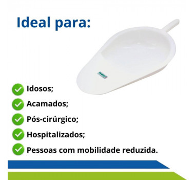 A Comadre de plástico é utilizada para coletar urina em pessoas do sexo feminino e tem capacidade para 2 Litros. Ela é utilizada no auxilio de pessoas acamadas e/ou com dificuldades de locomoção. É um produto de Fácil Higienização e possui um formato de Pá e apoio para transporte.