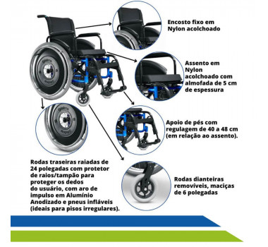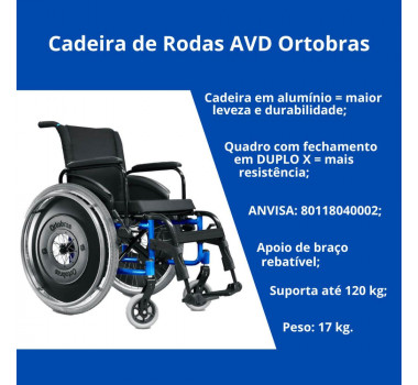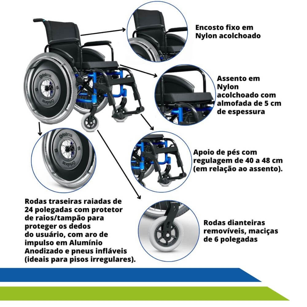 A Cadeira de rodas Ortobras é indicada para pessoas com incapacidade física ou com dificuldades de locomoção. Ela proporciona segurança, conforto e qualidade, com o mais de moderno em estética e tecnologia avançada. Fabricada em alumínio aeronáutico que permite sua leveza e alta resistência, dobrável em X facilita o transporte e armazenamento. Além disso, é totalmente desmontável e pode ter as rodas traseiras e dianteiras facilmente retiradas, sem a necessidade de ferramentas, e com apenas o clique em um botão, o apoio dos pés também pode ser retirado. O quadro possui um sistema de fechamento lateral que deixa a estrutura muito compacta para guardar em qualquer lugar.