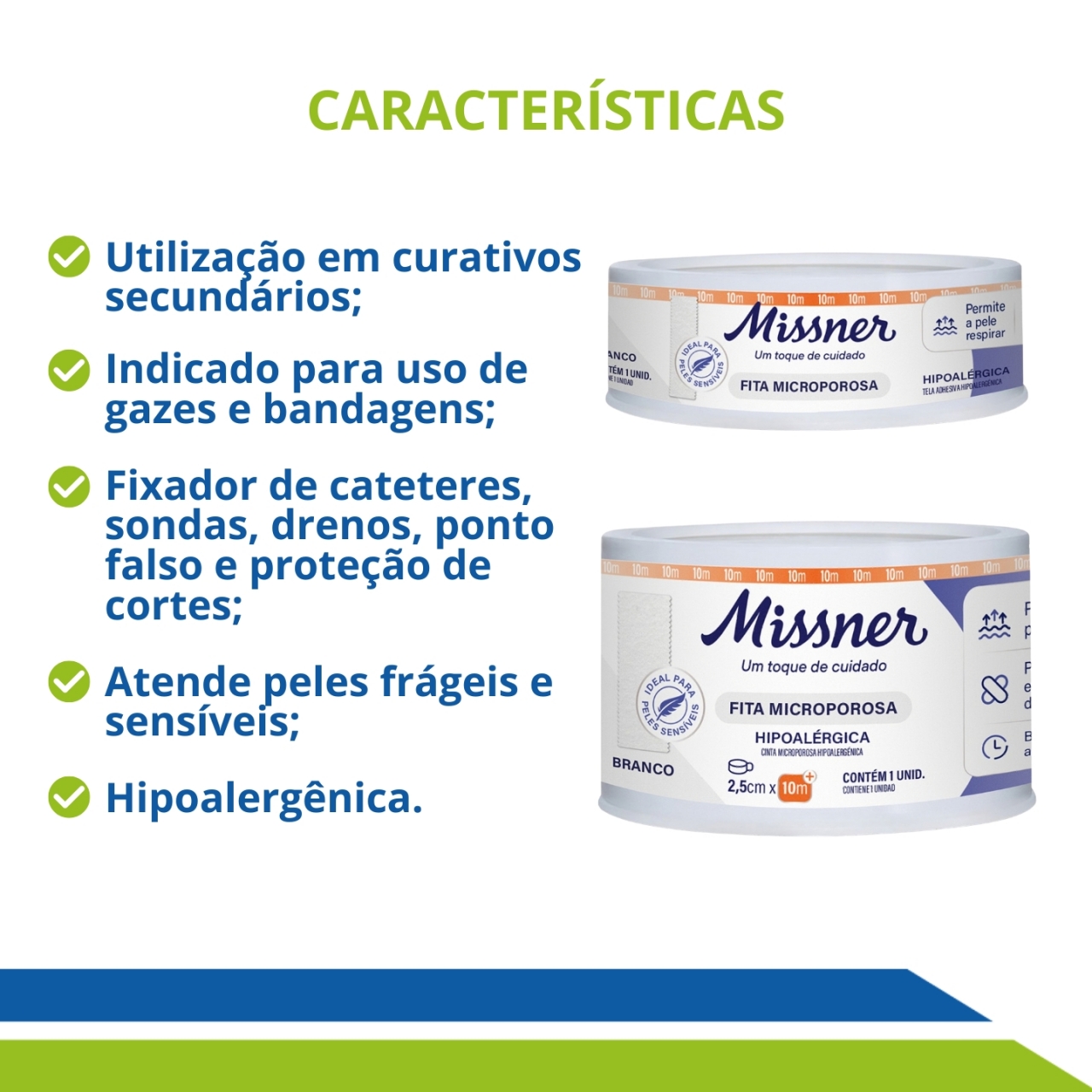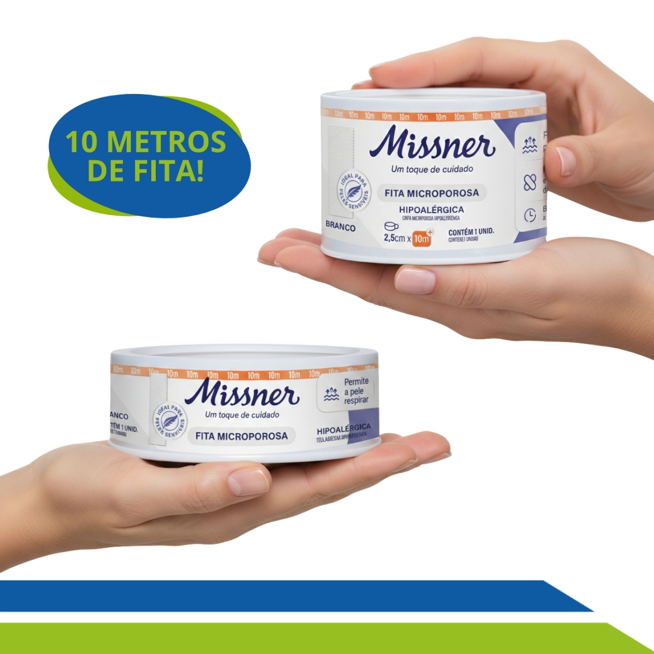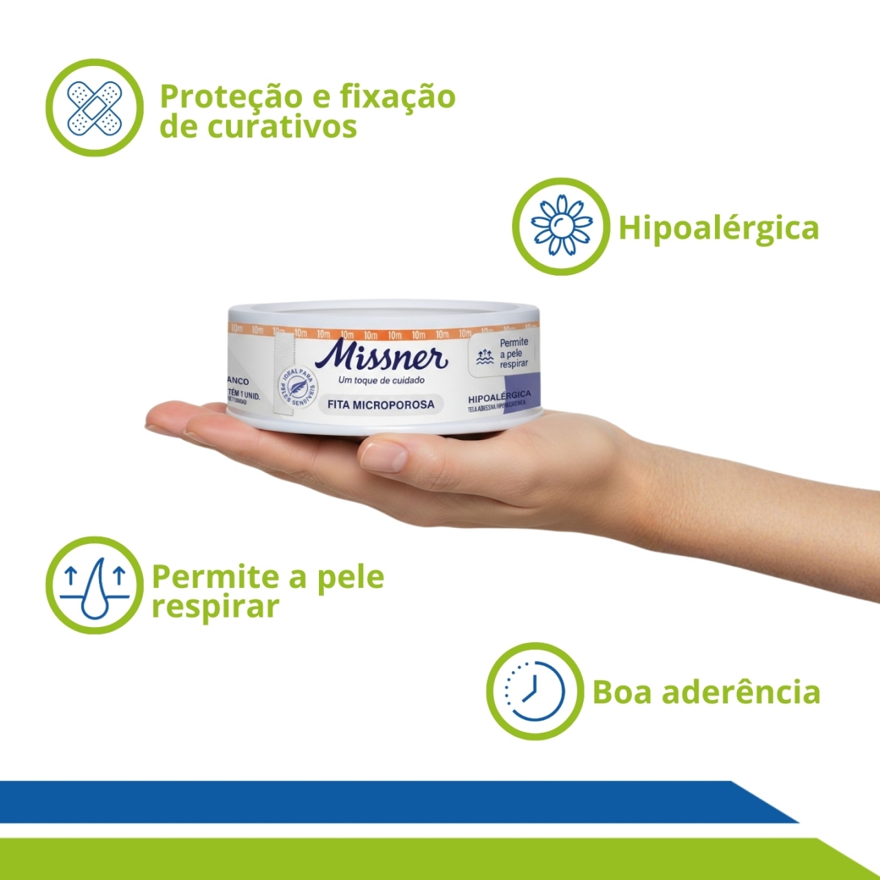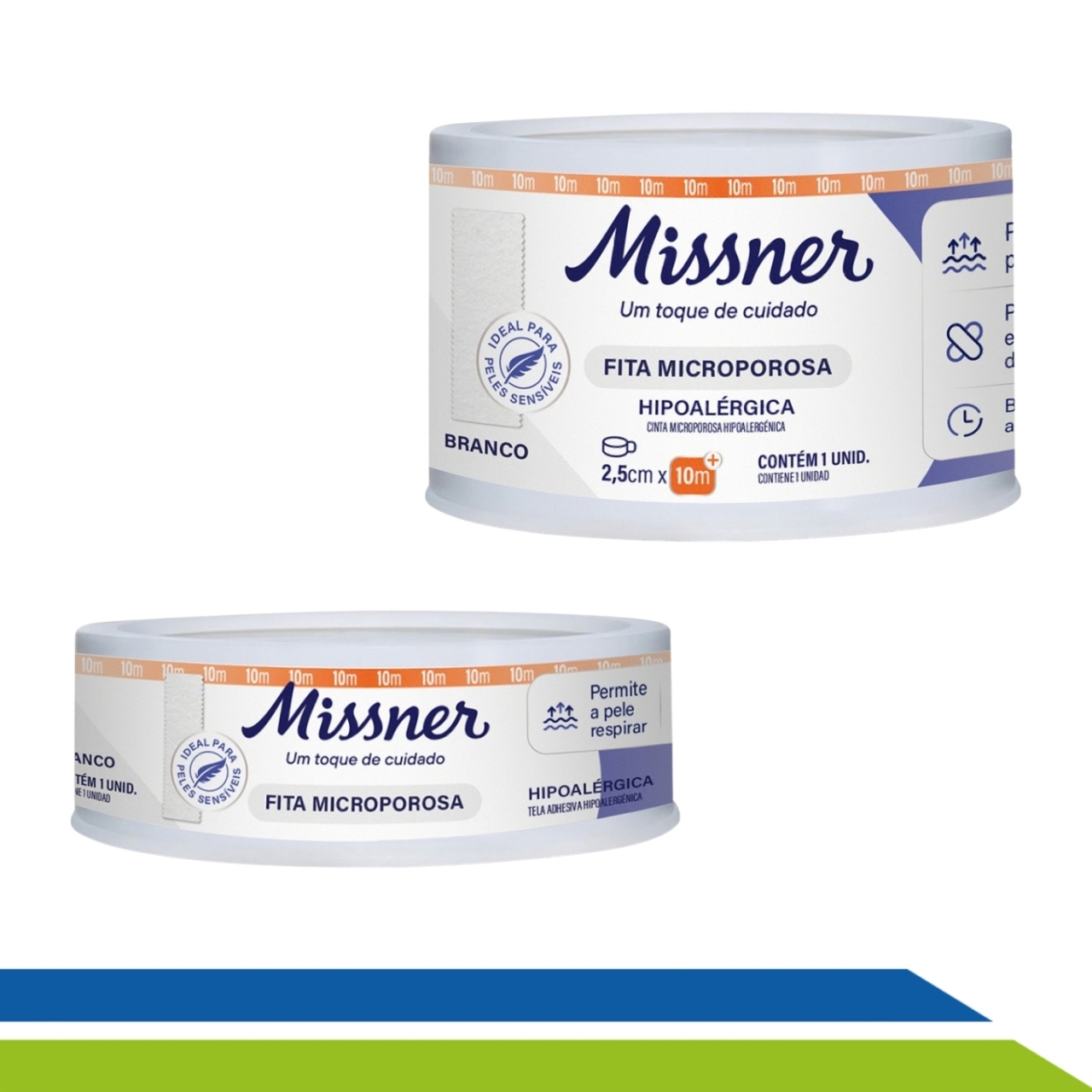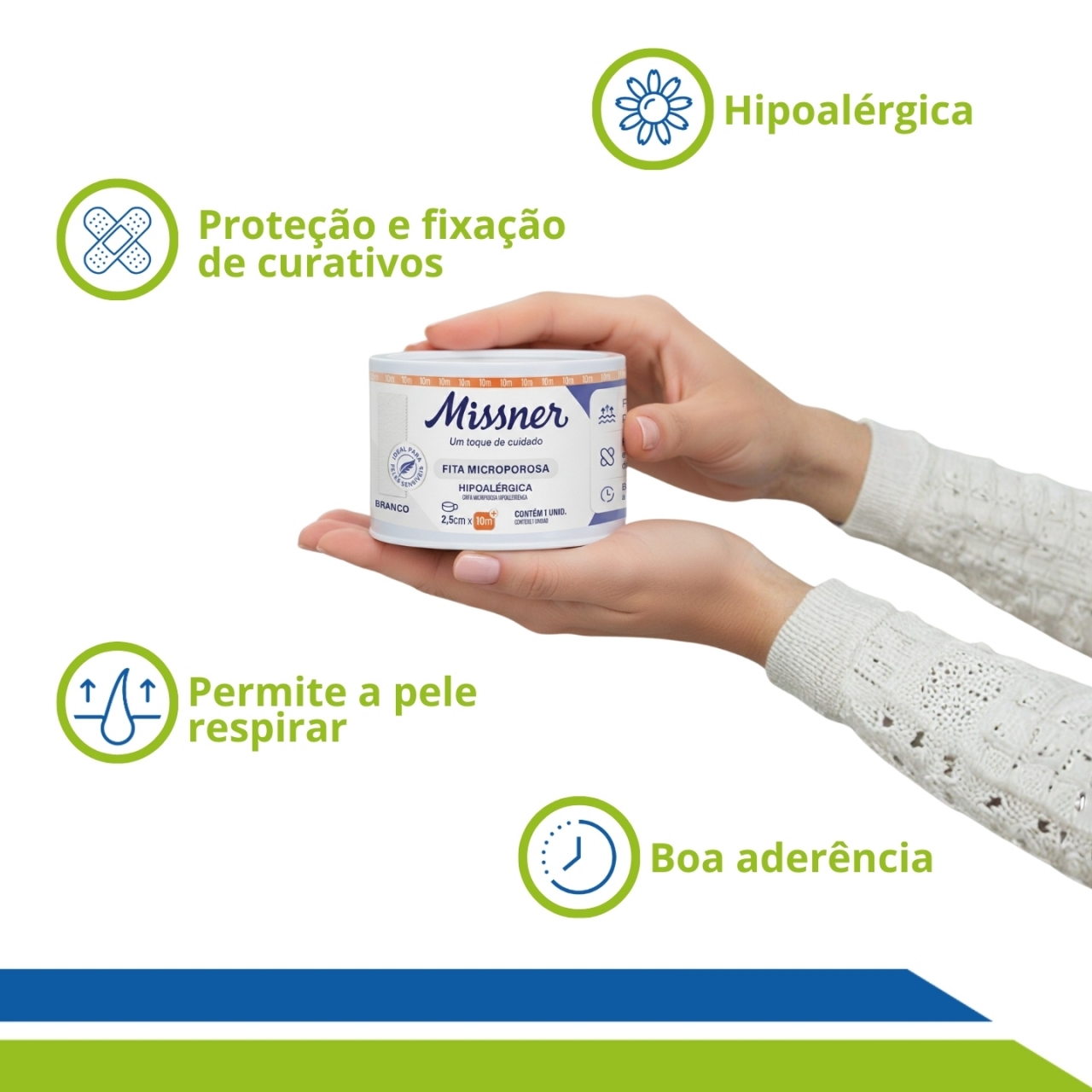 A Fita Microporosa Branca da Missner é ideal para fixação de curativos, gazes, bandagens, cateteres, sondas e drenos, oferecendo segurança, conforto e proteção da pele, especialmente em peles sensíveis e frágeis.