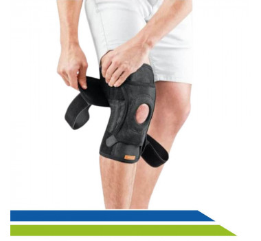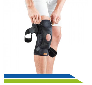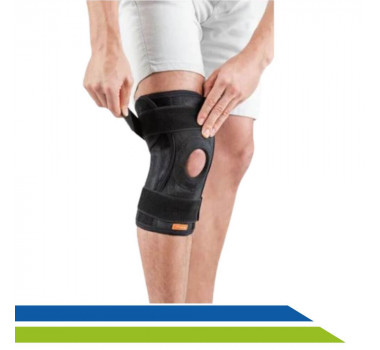 Seu diferencial em relação a outros modelos é que a Joelheira possui ajuste patelar de 4 pontas auxiliando na compressão e posicionamento na região da patela. O orifício patelar é oval, mais anatômico e acomoda um tubo interno emborrachado para aumentar o alívio da tensão no tendão patelar.