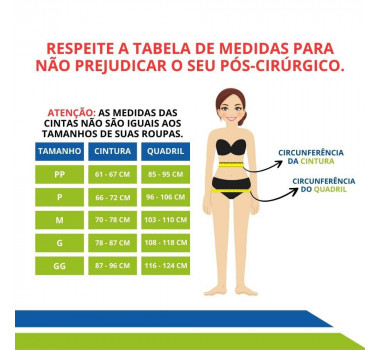 Para saber o tamanho correto da cinta você precisa medir a circunferência da cintura e do quadril, com o auxílio de uma fita métrica contorne sua cintura mais ou menos dois dedos acima da altura do umbigo, já para o quadril você deve medir logo abaixo do osso lateral mais saliente do quadril, geralmente fica cerca de 20 cm abaixo da cintura.