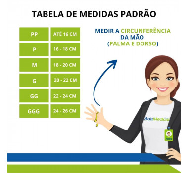 Com a ajuda de uma fita métrica, tire a medida da circunferência da palma da mão, compare a sua medida com a tabela de medidas.