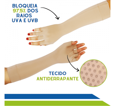 As luvas e manguito de proteção solar da New Form bloqueiam 97,5% dos raios UVA e UVB. É recomendada para uso no dia a dia, ao exercer atividades como caminhar, pedalar, dirigir e em todos os momentos que suas mãos e/ou braços ficarem expostas ao sol por muito tempo. Também é aconselhável para tratamentos dermatológicos que exigem que a pele não seja exposta ao sol (aplicações de laser, pós peeling e queimaduras).