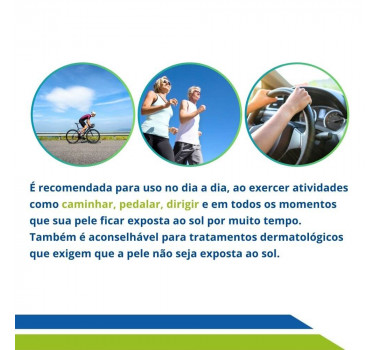 Ele é indicado para retardar o envelhecimento, evitar manchas e o aparecimento de câncer de pele. Ele possui ação protetora solar que não sai durante as lavagens, garantindo que seu produto dure por muito tempo. Com sua maleabilidade é possível dirigir e até praticar esportes com segurança e ter a proteção necessária contra os raios UVA e UVB.